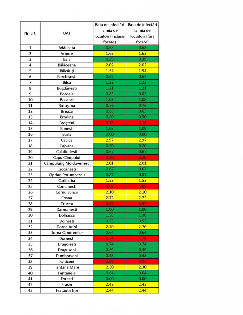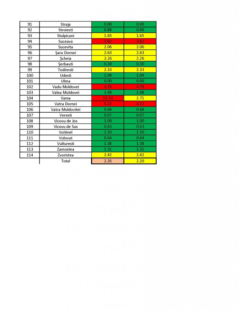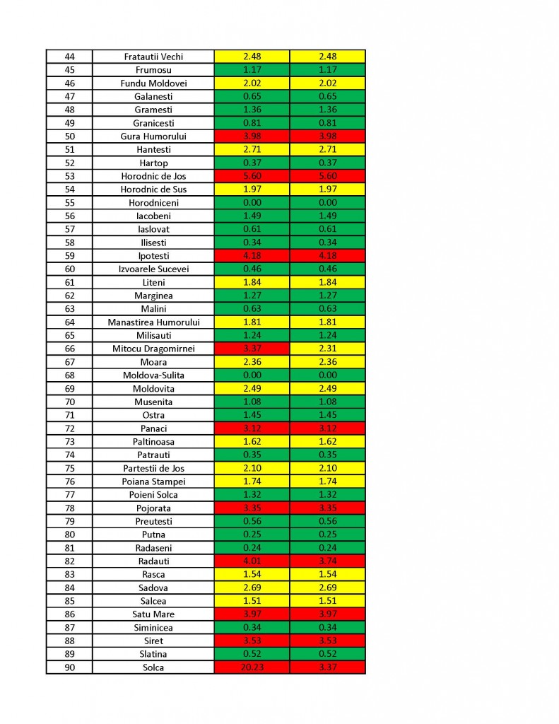 Coeficientul cumulat la 14 zile de infectare a ajuns, sâmbătă, în municipiul Suceava la 3,82 la mia de locuitori. Cea mai mare rată cumulată de infectare este în Solca, cu 20,23 la mia de locuitori cu tot cu cazurile din focar, și de 3,37 la mie fără aceste cazuri. În Rădăuți rata este de 4,01, iar la Vatra Dornei de 4,22 la mie.