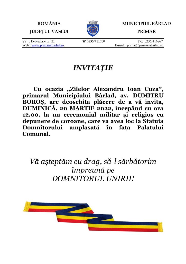 „Cu ocazia „Zilelor Alexandru loan Cuza”, primarul Municipiului Bârlad, av. Dumitru Boroș are deosebita plăcere de a vă invita, duminică, 20 martie 2022, începând cu ora 12.00, la un ceremonial militar și religios cu depunere de coroane, care va avea loc la Statuia Domnitorului amplasată în fața Palatului Comunal.