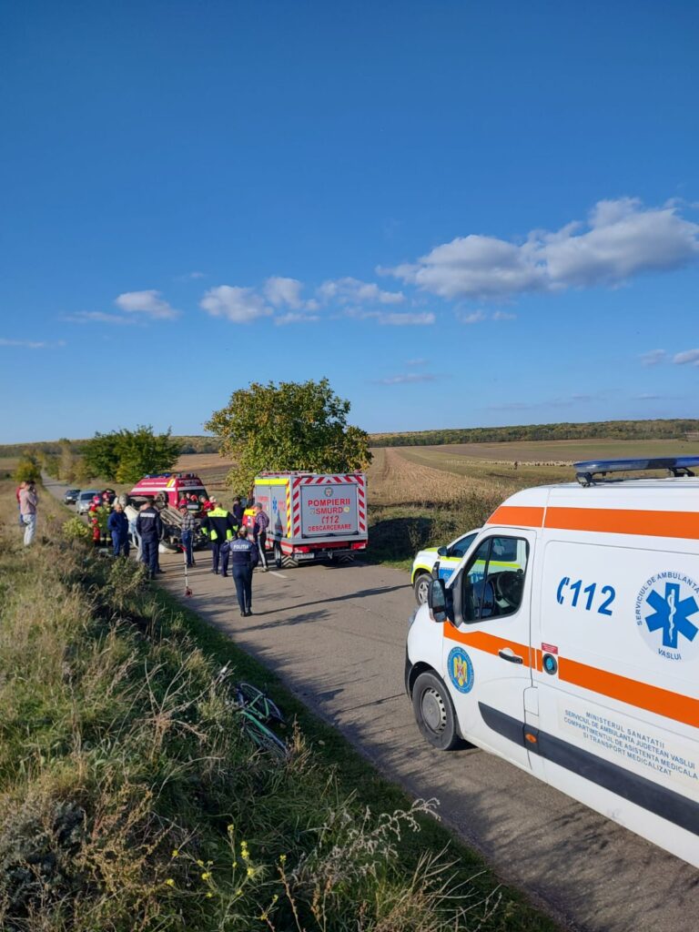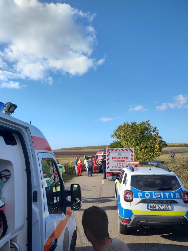Accident rutier la Viișoara de Bârlad, o mașină răsturnată. Sunt două victime inconștiente și încarcerate. Au fost trimise o ambulanță SAJ C2 cu medic și un echipaj de prim ajutor de la ISU.