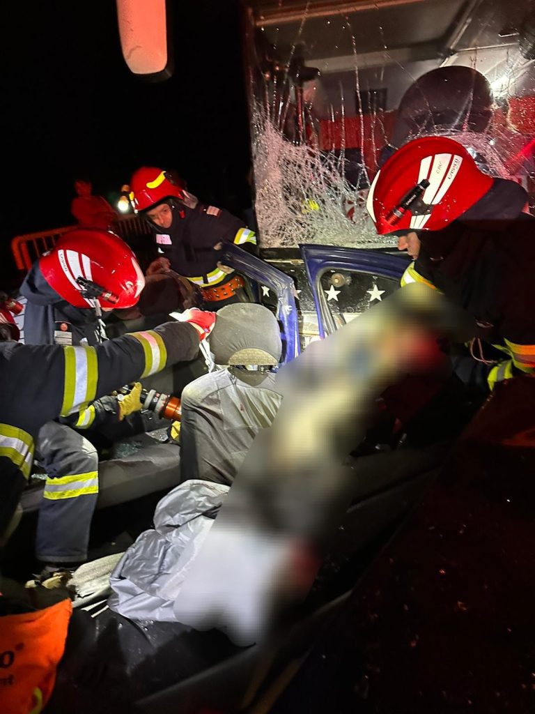 Pompierii au efectuat manevrele pentru descarcerare concomitent cu acțiunile medicilor și paramedicilor pentru stabilizarea victimelor.