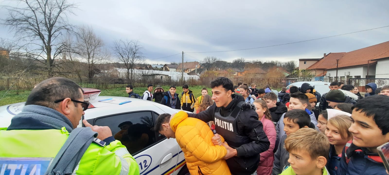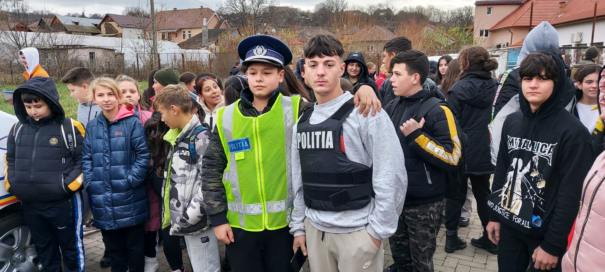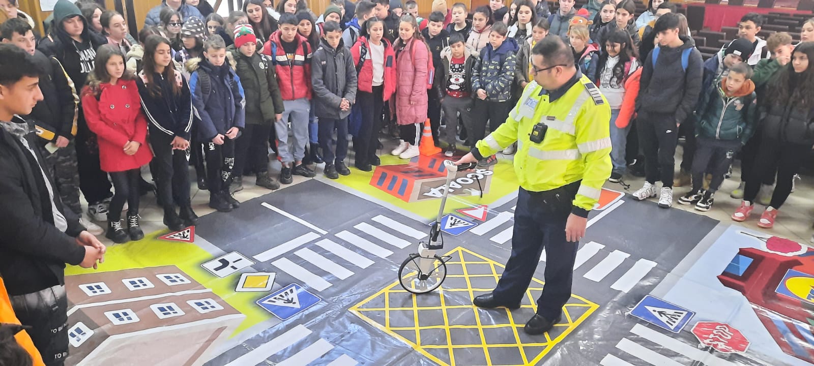 Polițiștii au simulat un traseu aplicativ, parcurgând itinerariul casă-școală-magazin-locul de joacă, evidențiind totodată potențialele pericole întâlnite pe parcurs.