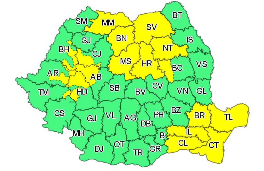Al doilea Cod galben vizează județele Mureș, Bistrița Năsăud, Suceava, Neamț, Bacău, Harghita, Mureș, Bihor, Cluj, Alba, Hunedoara, Arad, Timiș, Brăila, Tulcea, Ialomița, Călărași și Constanța.