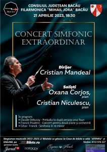 Filarmonica Mihail Jora Bacău are onoarea și plăcerea de a îl avea ca invitat pentru prima dată pe dirijorul Cristian Mandeal. Avem ocazia de a asculta orchestra Filarmonicii din Bacău sub bagheta maestrului Cristian Mandeal (împreună cu soliștii Oxana Corjos și Cristian Niculescu) vineri 21 aprilie de la ora 18.30.