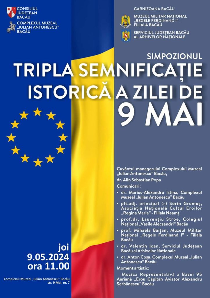 Complexul Muzeal „Iulian Antonescu” Bacău organizează joi, 9 mai 2024, începând cu ora 11.00, simpozionul „Tripla semnificaţie a zilei de 9 Mai”. Manifestarea este dedicată sărbătoririi a trei momente importante din istoria naţională şi universală: proclamarea independenţei de stat a României (1877), victoria asupra Germaniei naziste (1945) şi Ziua Europei (oficializată în 1985, pentru a marca data istoricei Declaraţii Schuman din 1950).