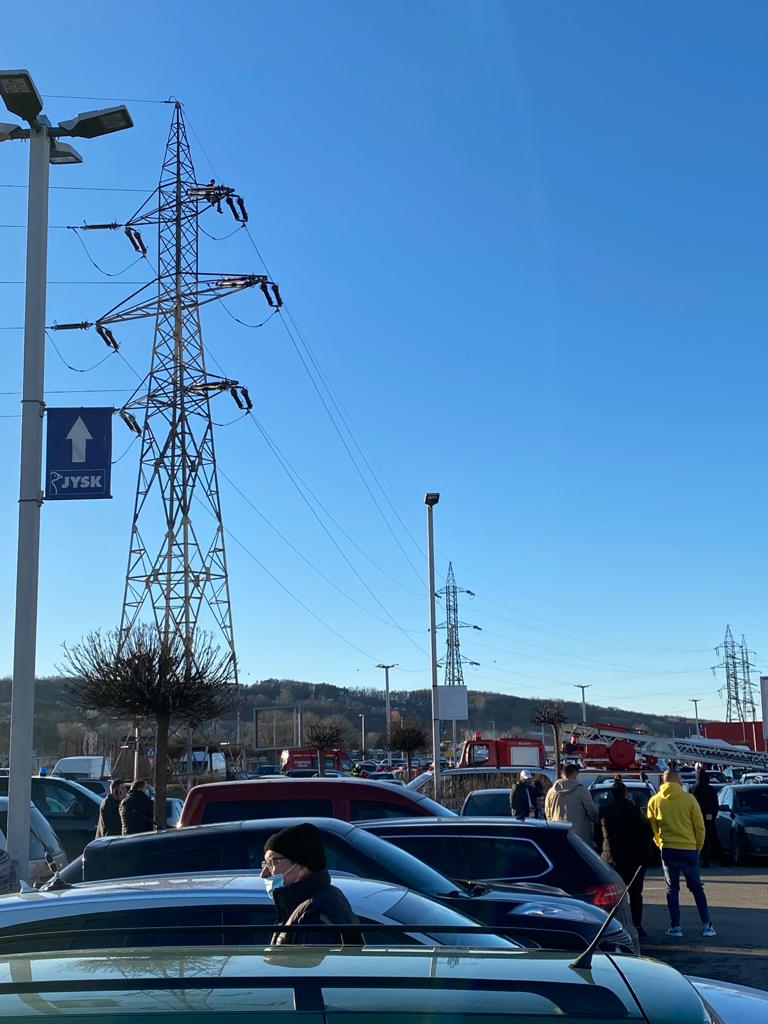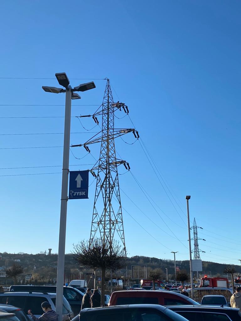 Bărbat căţărat pe un stâlp de înaltă tensiune, la un centru comercial din Suceava (Foto/video)