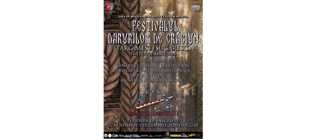 Festivalul Darurilor de Crăciun va avea loc la Centrul Cultural Reduta, oferind un prilej de întâlnire între iubitorii tradițiilor și artizanii din întreaga țară. În cadrul evenimentului, 20 de meșteșugari și artizani autentici vor expune creații variate: pielărie, tâmplărie, olărit, pictură pe sticlă, broderii, împletituri și multe altele. Artizanii interesați sunt invitați să participe cu […]
