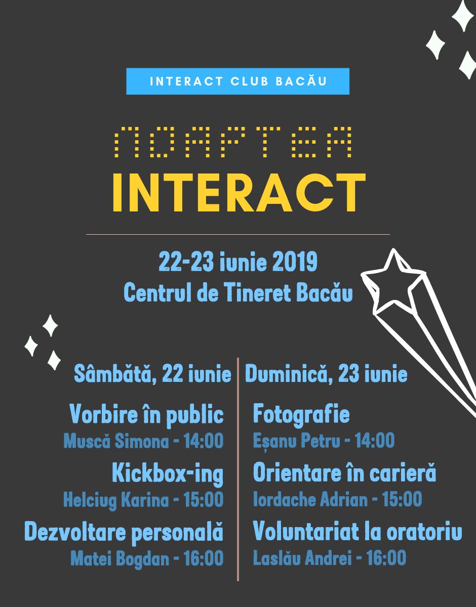 Membrii Interact te așteaptă pe 22 și 23 iunie, la Centrul de Tineret din Bacău, cu o serie de 6 ateliere interactive pentru ca tu să ai parte de o experiență de neuitat și pentru a te învăța lucruri inedite! „ Mai jos se regăsesc toate atelierele din cadrul evenimentului „Noaptea Interact” : Sâmbătă, 22 […]