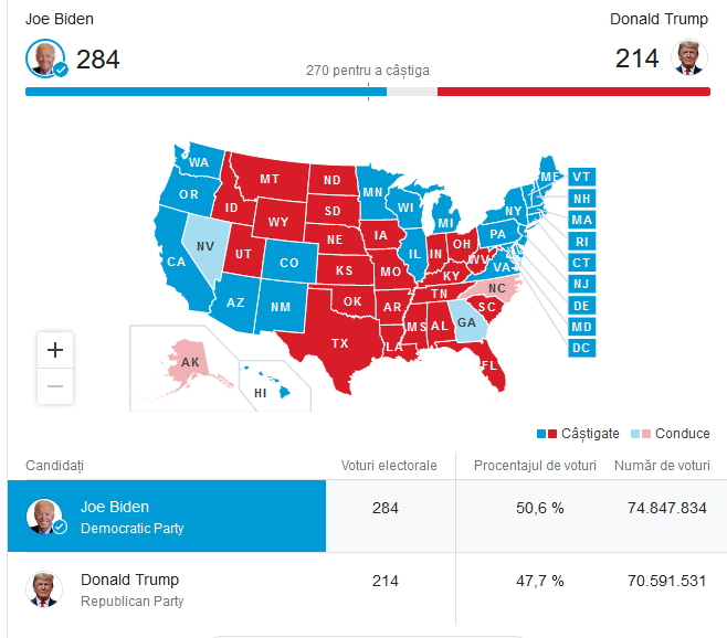 Donald Trump are în acest moment 214 electori și este în afara luptei pentru Casa Albă, chiar dacă au mai rămas 4 state în care numărătoarea nu s-a terminat.