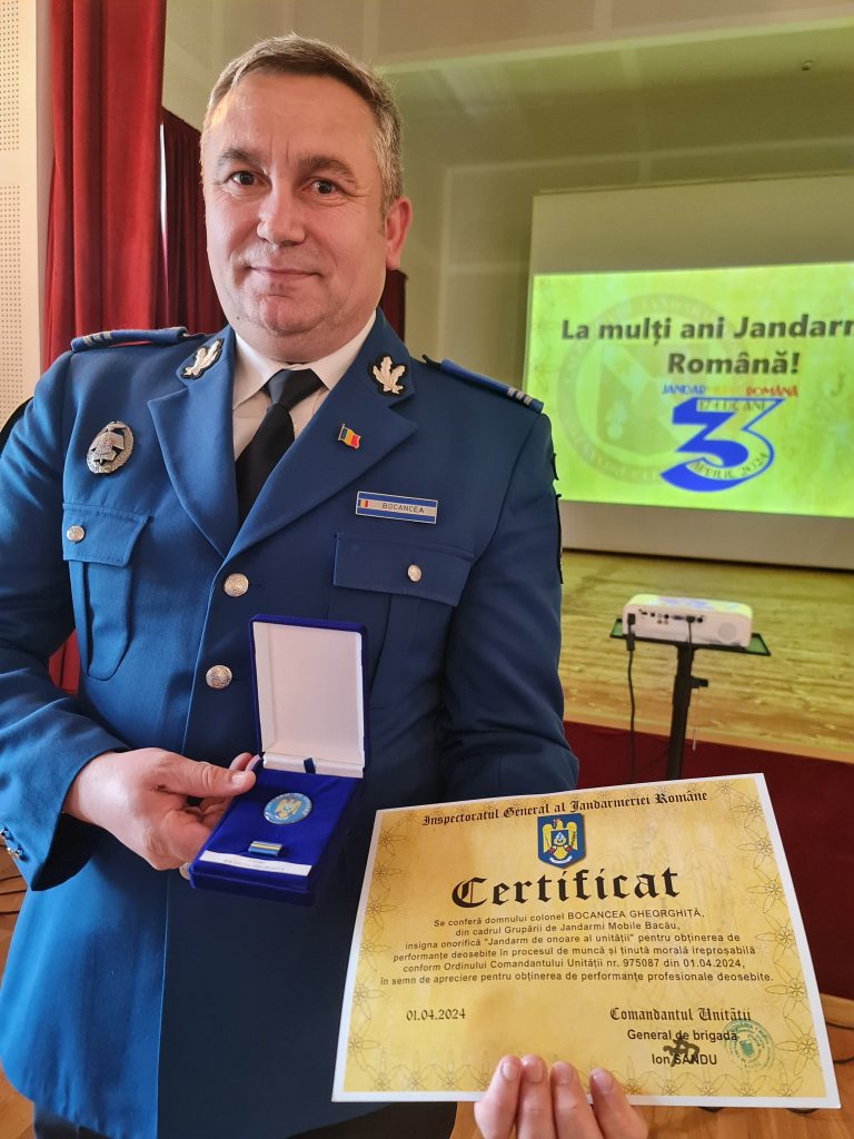 Insigna onorifică „Jandarm de onoare al unității” a fost conferită, în acest an, unui asemenea om, domnului colonel Gheorghiță Bocancea.