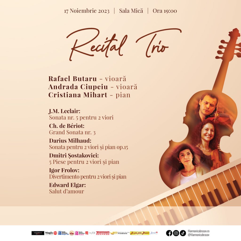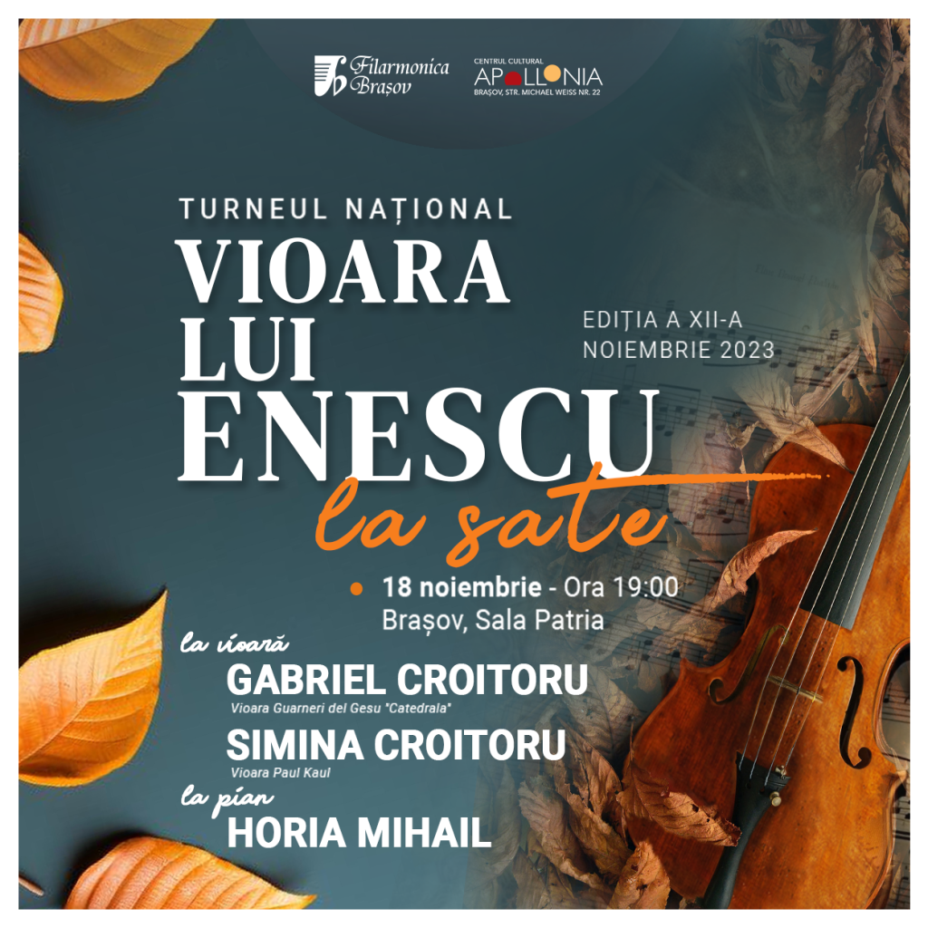 După concertul de joi, Filarmonica Brașov mai invită melomanii la încă două evenimente muzicale săptămâna aceasta. Vineri, 17 noiembrie, la Sala muzicii de cameră va avea loc un recital cu violoniștii Rafael Butaru și Andrada Ciupeiu și pianista Cristiana Mihart, iar sâmbătă seară, turneul național Vioara lui Enescu va ajunge la Brașov. Publicul îi va putea asculta pe Gabriel Croitoru, Simina Croitoru și Horia Mihail începând cu ora 19.