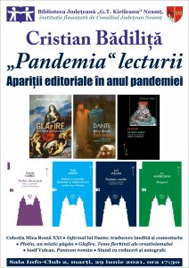 Biblioteca Județeană „G.T. Kirileanu“ găzduiește conferința „«Pandemia» lecturii. Apariții editoriale în anul pandemiei“, marți, 29 iunie, începând cu ora 17:30, în Sala Cupola.
