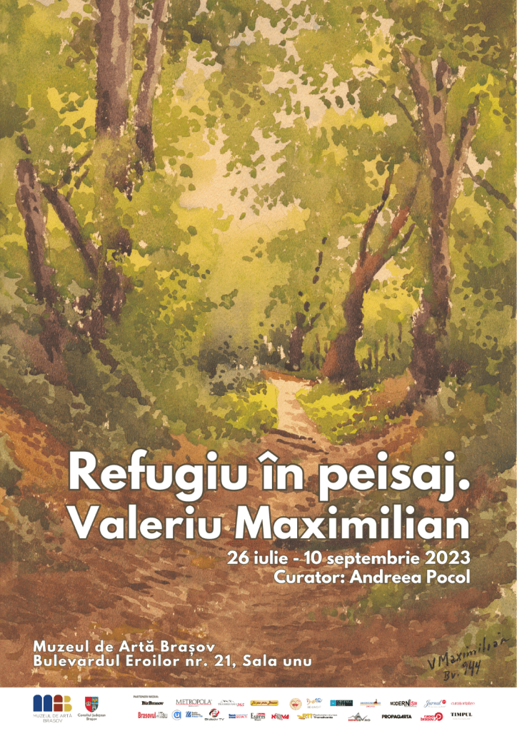 Expoziția „Refugiu în peisaj. Valeriu Maximilian”, curator Andreea Pocol, desfășurată în perioada 26 iulie – 10 septembrie 2023, aduce în atenția publicului o selecție de peisaje în acuarelă realizate de îndrăgitul artist brașovean Valeriu Maximilian (1895-1945). Vizitatorii vor putea călători pe urmele sale în lucrările expuse în Sala unu de la parterul muzeului.