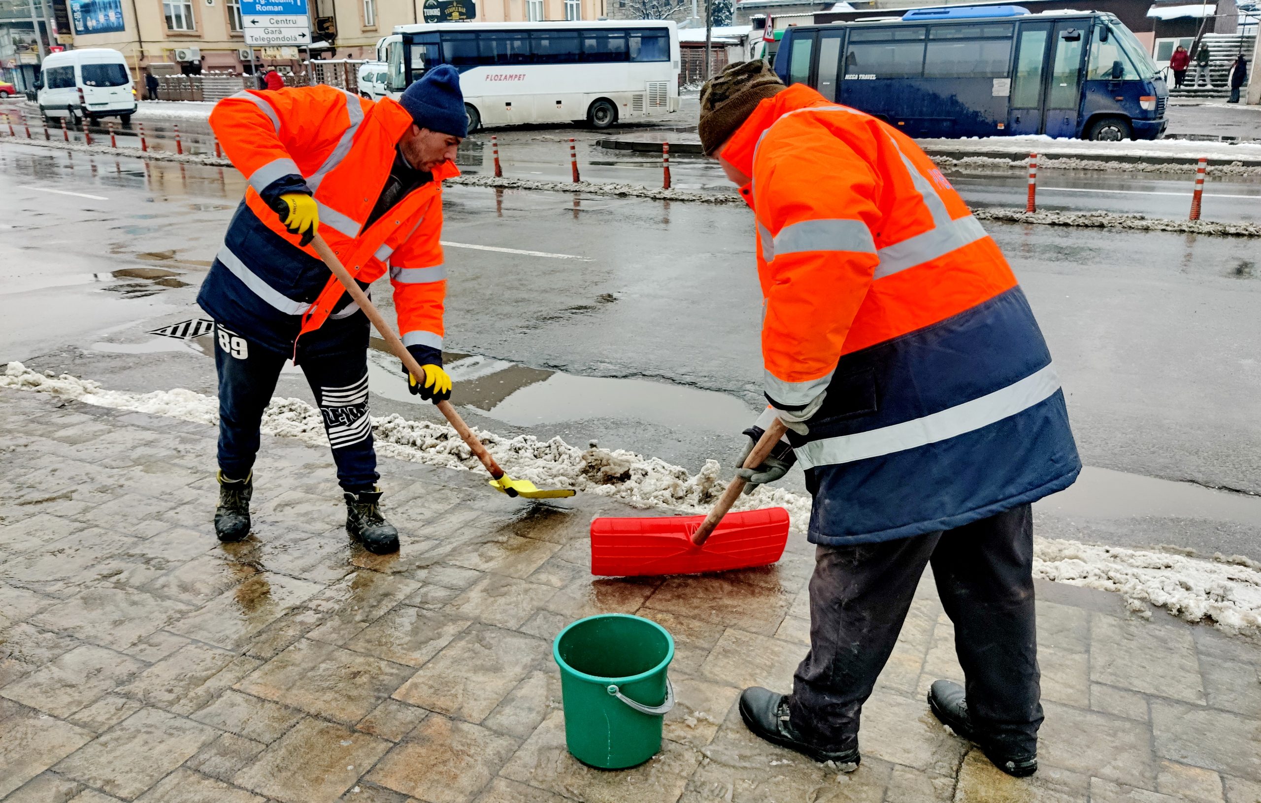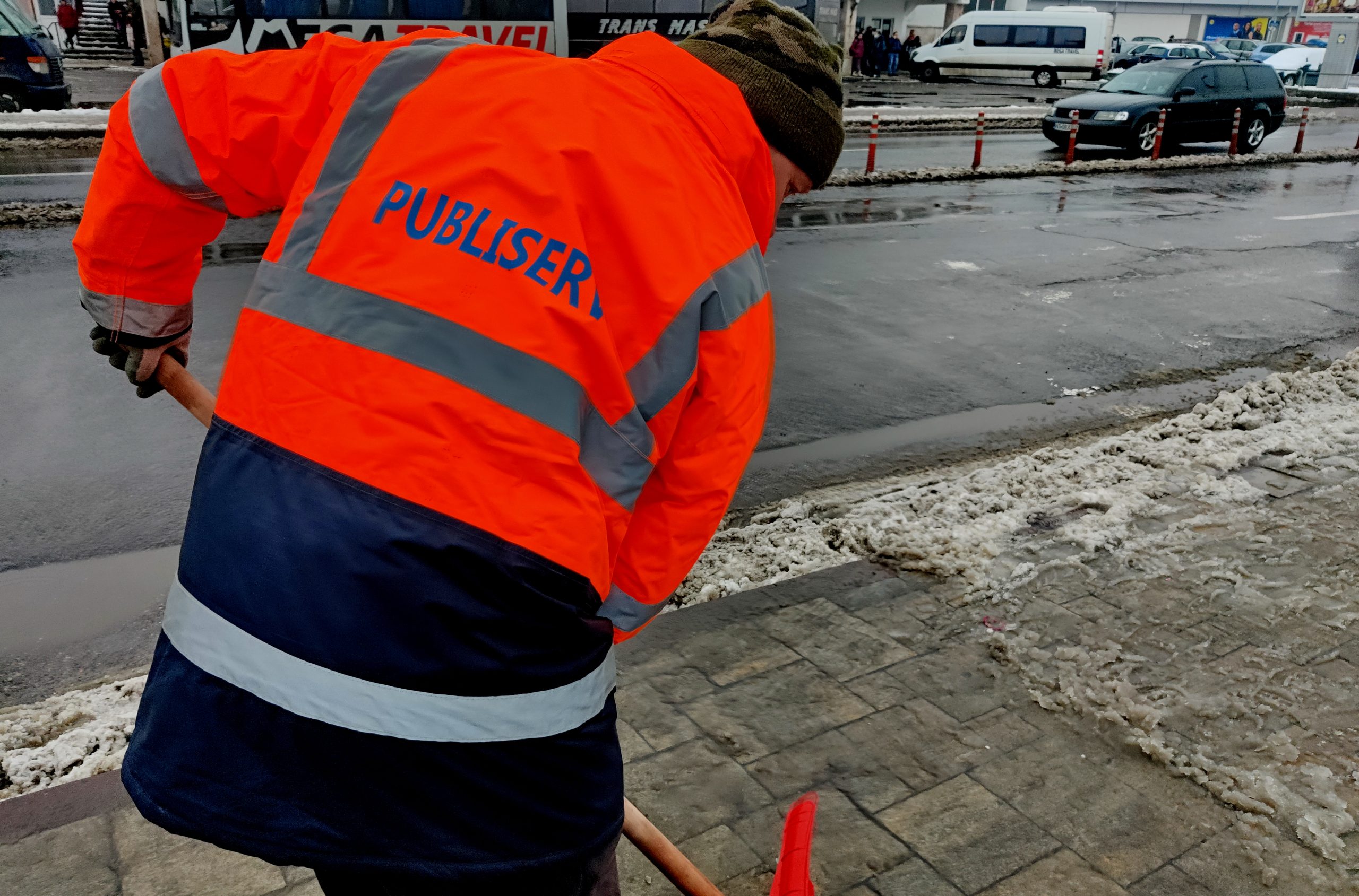 Pentru siguranța pietonilor care se deplasează prin oraș și pentru a asigura fluența traficului pietonal, de la primele orele ale dimineții echipele Societății Publiserv intervin manual pentru a împrăștia sare și a curăța trotuarele, trecerile de pietoni, scările și stațiile de transport public.