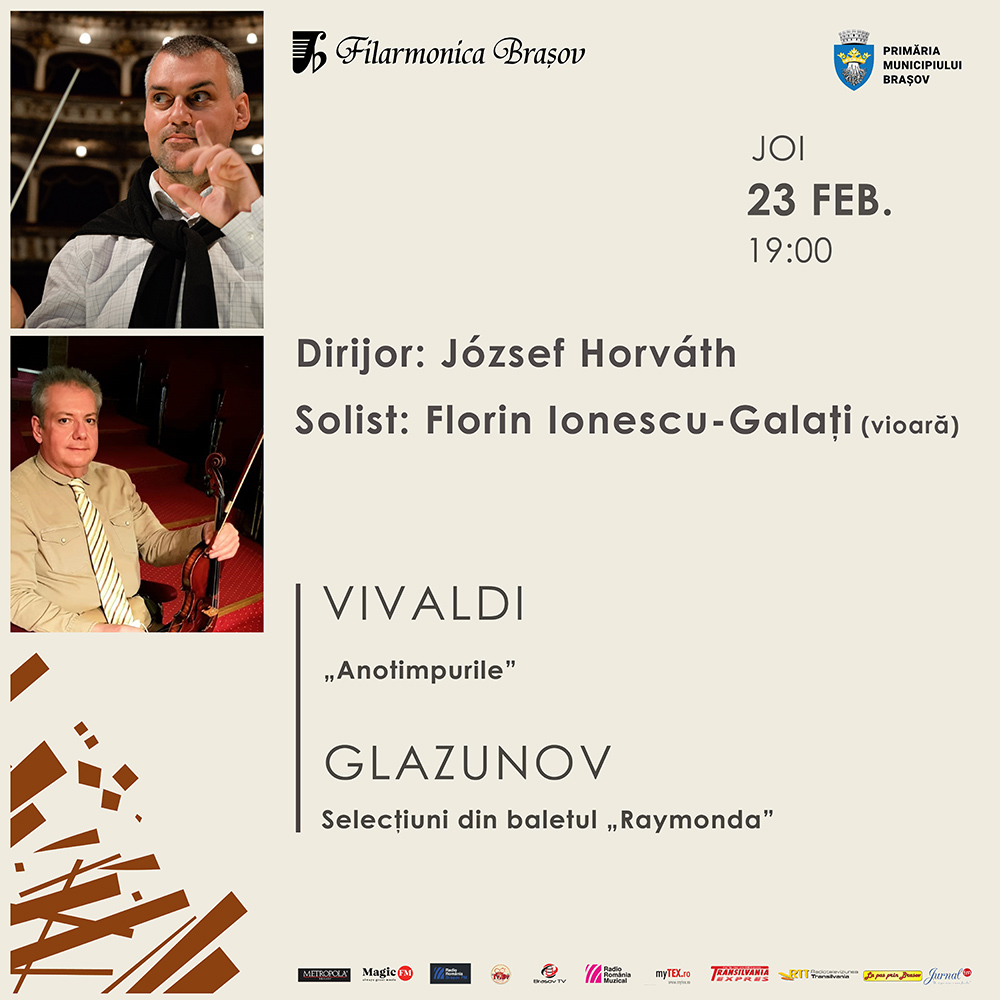 Ultimul concert din această lună al Filarmonicii Brașov va avea loc în această joi, pe 23 februarie, de la ora 19 la Sala Patria. Iubitorii de muzică din oraș sunt așteptați să asculte celebrul ciclu de patru concerte Anotimpurile de Antonio Vivaldi, una dintre cele mai cunoscute și iubite compoziții clasice. Aceasta va fi interpretată de orchestra simfonică a Filarmonicii Brașov, iar solistul serii va fi violonistul brașovean Florin Ionescu-Galați.