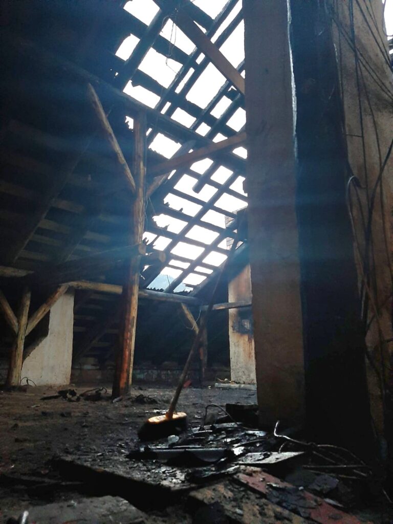 A ars acoperișul construit din lemn și acoperit cu tablă și carton asfaltat, pe o suprafață de aproximativ 120 de metri pătrați.