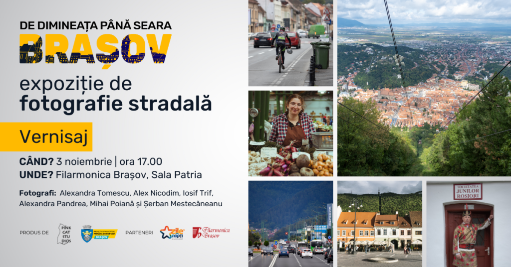 Joi, 3 noiembrie 2022, de la orele 17.00 la Sala Patria a Filarmonicii Brașov (Bulevardul 15 noiembrie 50A) are loc vernisajul expoziției de fotografie “De dimineața până seara, Brașov”, organizată de Pink Cat Studios.