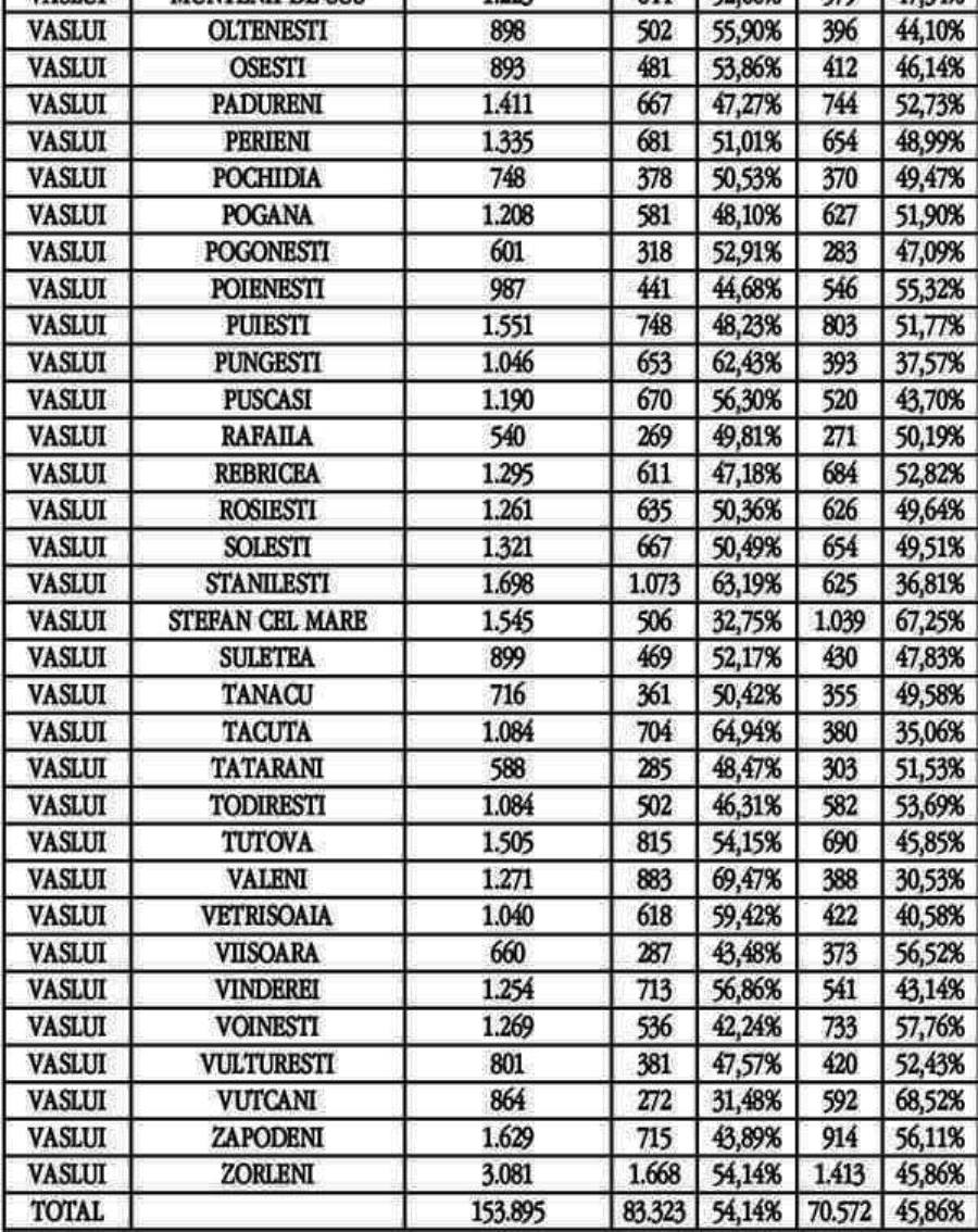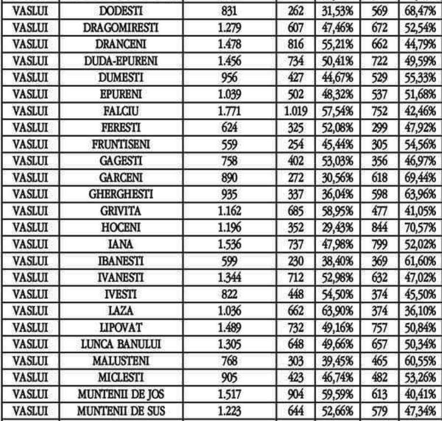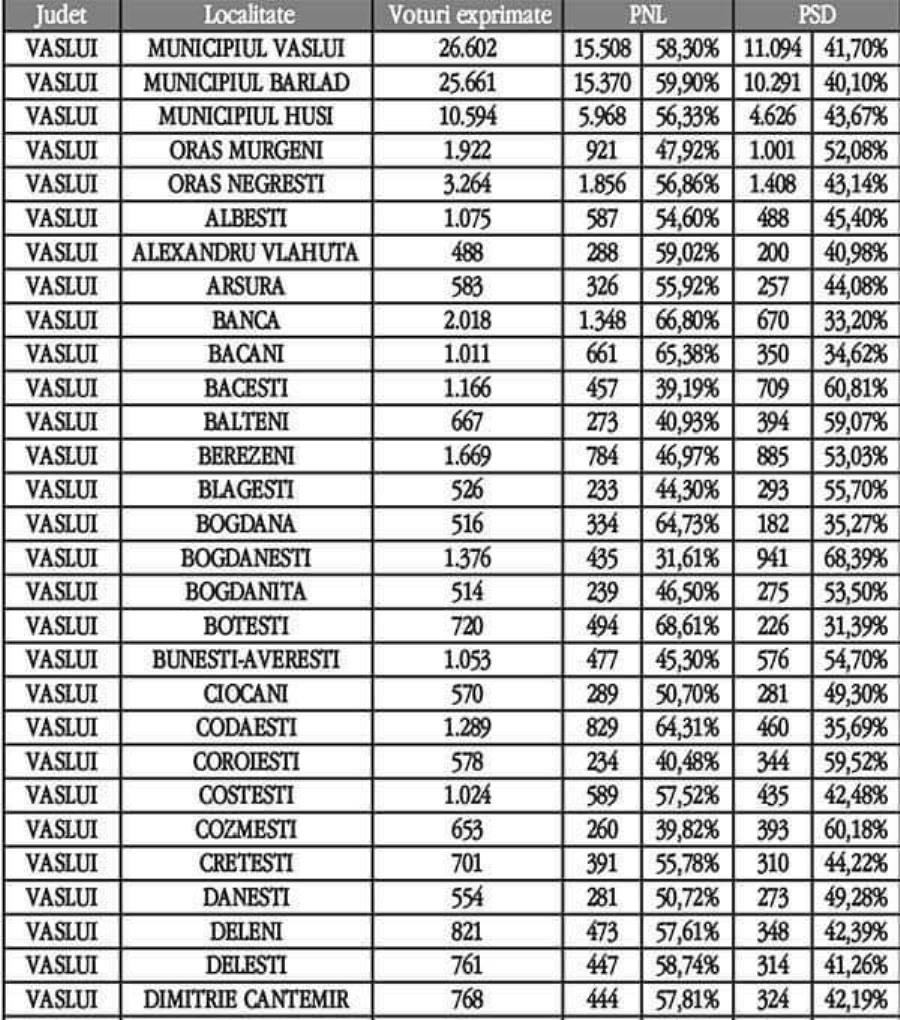 Rezultatele obținute de PNL și PSD la Vaslui, Huși, Bârlad și Negrești sunt următoarele: