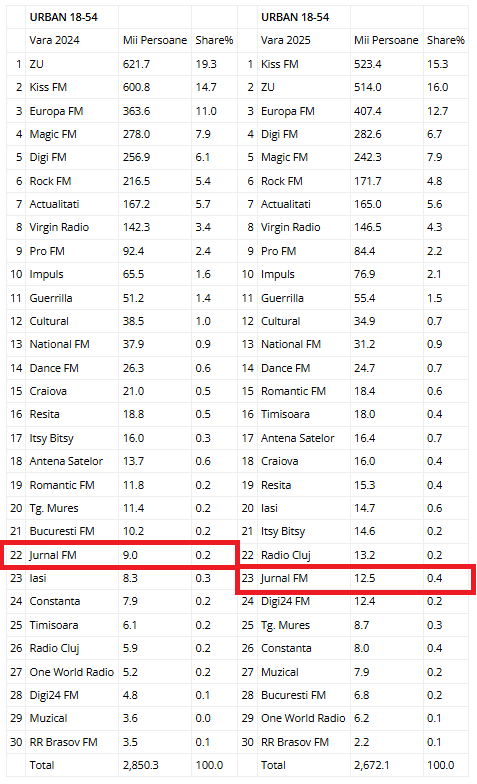 Audienţa posturilor de radio în mediul URBAN, în intervalul orar 7.00-10.00 (Prime-Time) în valul vară 2025, comparativ cu anul trecut: