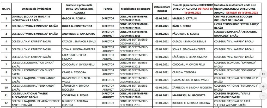 Lista completă poate fi consultată pe site-ul Inspectoratului Școlar Județean Bacău. Valul schimbărilor directorilor unităților școlare vine o dată la patru ani, dar sunt și excepții.