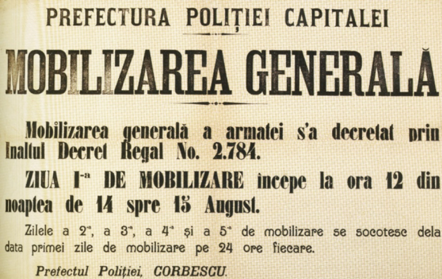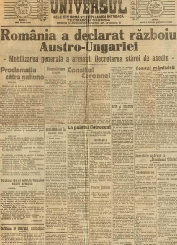 La 14/27 august 1916, ora 9 seara, după doi ani de neutralitate, România intra în primul război mondial. În aceeași zi, erau publicate, în Monitorul Oficial, „Ordinul de mobilizare al armatei române” și „Legea pentru declararea stării de asediu”. În numărul următor al monitorului, românii erau informați că la 14 august 1914 „guvernul Imperial și Regal al Austro-Ungariei” a fost anunțat de către ministrul plenipotențiar al României în Viena, Edgar Mavrocordato, că „cu începere de la 14/27 august 1916, ora 9 seara, România se găsește în stare de război cu Austro-Ungaria”. Erau publicate și proclamațiile regelui Ferdinand către români și soldați. În acestea erau precizate câteva dintre motivele intrării Regatului Român în prima conflagrație mondială: „unirea Româniilor de pe cele două părți ale Carpaților”, eliberarea „de sub stăpânirea străină pe frații noștri de peste munți și din plaiurile Bucovinei”. Soldaților români, descriși drept „vrednici urmași ai ostașilor cari au învins la Răsboieni, la Călugăreni și la Plevna”, li se cerea să se arate „demni de gloria străbună”.Regele le spunea că „o luptă aprigă vă așteaptă. Cu bărbăție să îi îndurăm însă greutățile și cu ajutorul lui Dumnezeu isbânda va fi a noastră”. I. G. Duca, ministrul Cultelor și Instrucțiunii în guvernul Ion I. C. Brătianu, transmitea o telegramă directorilor de școală prin care le cerea să-i convoace pe toți „școlarii” care se aflau în comună pentru a li se comunica „însemnătatea ceasului ce trăiesc”. Se mai spunea că: „Armata română a fost mobilizată.Răsboiul în care pornește e răsboiul de desrobire și de întregire a neamului. Ea pleacă să înfăptuiască visul nostru de veacuri, speranța cu care înaintașii noștri au trăit și au putut birui urgia vremurilor. Deși școlarii sunt în vacanță, clipa aceasta e prea hotărîtoare ca să nu se pătrundă cu toții de măreția ei și ca în toată vieața lor să nu-i păstreze amintirea neștearsă. De aceea vă rugăm ca de urgență să adunați pe toți elevii școalei d-voastre, pe cari îi veți putea găsi în localitate și să le arătați însemnătatea ceasului ce trăiesc. Să le spuneți că România intră în luptă pentru a pune capăt suferințelor de veacuri ale fraților noștri de peste munți și din Bucovina, pentru a le reda putința ca într’o Românie liberă și întregită să se desvolte în pace. Să-i faceți să priceapă bine că răsboindu-ne pentru o cauză dreaptă alături de marile popoare, cari apără și ele principiul naționalităților, România are nevoie de ajutorul tuturor fiilor ei și că și dânșii trebuie să contribuie în marginile puterilor lor la sforțarea care va asigura națiunii isbânda așteptată. […]. În fine, veți veghia ca, pe cît se poate, școlile în corpore și cu drapelurile lor să asiste la plecarea trupelor și să salute pe cei cu atâta avânt pornesc sub conducerea Regelui Nostru, care și-a însușit toate aspirațiunile neamului, că să lupte pentru gloria și mărirea patriei”. Mitropoliții și episcopii erau rugați printr-o altă telegramă a lui I. G. Duca „să ia imediat măsuri ca pretutindeni preoții să binecuvânteze pe cei ce cu atâta având pleacă să jertfească pentru mărirea neamului” și „să se facă în toate bisericile […] cuvenitele rugăciuni pentru isbânda oștilor Române”.