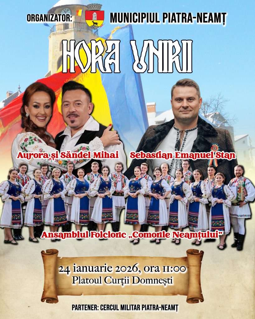 Municipiul Piatra-Neamț marchează pe 24 ianuarie împlinirea a 167 de ani de la Unirea Principatelor Române printr-un eveniment cultural-artistic organizat la Curtea Domnească, începând cu ora 11.00. Manifestarea, realizată în parteneriat cu Cercul Militar Piatra-Neamț, va include momente de muzică populară susținute de interpreți apreciați și de Ansamblul Folcloric „Comorile Neamțului”. Participanții vor primi stegulețe tricolore și vor fi invitați să se prindă în Hora Unirii, într-o atmosferă festivă, animată de confetti în culorile drapelului național. Evenimentul își propune să promoveze valorile naționale, să întărească identitatea culturală a comunității și să încurajeze participarea publicului la celebrarea unui moment definitoriu din istoria României.