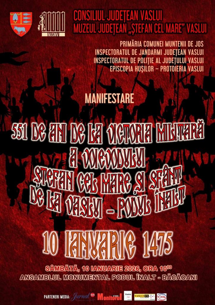 Muzeul Județean „Ștefan cel Mare” din Vaslui a organizat pe 10 ianuarie 2026, în cadrul Ansamblului Monumental Podul Înalt – Băcăoani, manifestarea dedicată aniversării a 551 de ani de la Bătălia de la Vaslui – Podul Înalt, desfășurată pe 10 ianuarie 1475. Evenimentul a fost organizat de Consiliul Județean Vaslui și Muzeul Județean „Ștefan cel Mare” Vaslui, în colaborare cu Primăria comunei Muntenii de Jos, Brigada 15 Mecanizată „Podu Înalt” Iași, Inspectoratul de Poliție Județean Vaslui, Inspectoratul de Jandarmi Județean Vaslui și Episcopia Hușilor – Protopopiatul Vaslui.