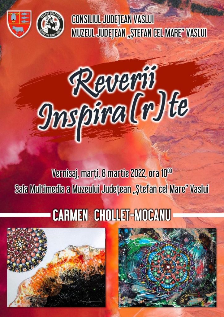 Muzeul Județean „Ștefan cel Mare” Vaslui, aflat sub egida Consiliului Județean Vaslui, are deosebita plăcere de a vă invita să participați la vernisajul expoziției de pictură „REVERII INSPIRA(R)TE”, a doamnei profesor Carmen CHOLLET-MOCANU.