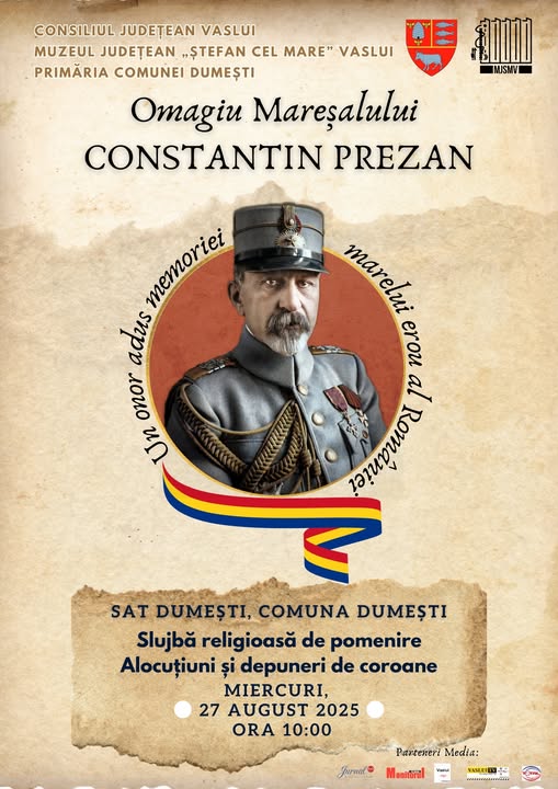Miercuri, 27 august 2025, Muzeul Județean „Ștefan cel Mare” Vaslui, instituție de cultură aflată sub egida Consiliului Județean Vaslui, în parteneriat cu Primăria Comunei Dumești, va organiza un eveniment comemorativ dedicat evocării memoriei marelui erou național, mareșalul Constantin Prezan.