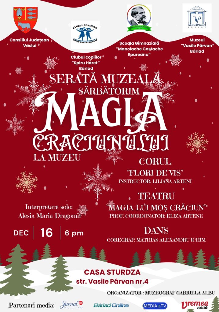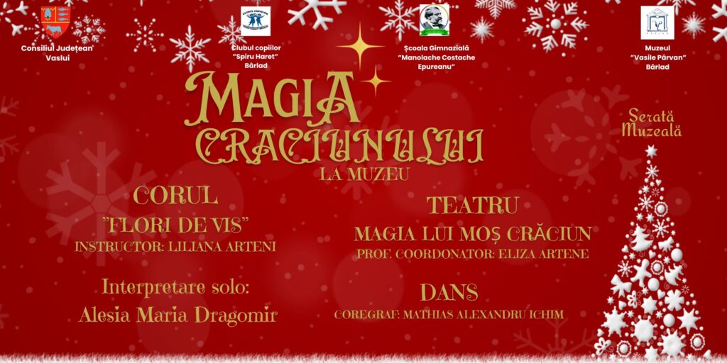 Muzeul „Vasile Pârvan”, Bârlad, vă invită, vineri, 16 decembrie 2022, ora 18:00, la o activitate cu și despre copii, alături de Cercul de Teatru de la Clubul Copiilor „Spiru Haret” și Școala Gimnazială „Manolache Costache Epureanu” care s-au pregătit să ne surprindă cu momente pline de magie, desprinse din suflet, pentru a fi oferite persoanelor pe care le apreciem cel mai mult, prin muzică, teatru și dans, momente create pentru a celebra viața, frumusețea ei și miracolul de a dărui.