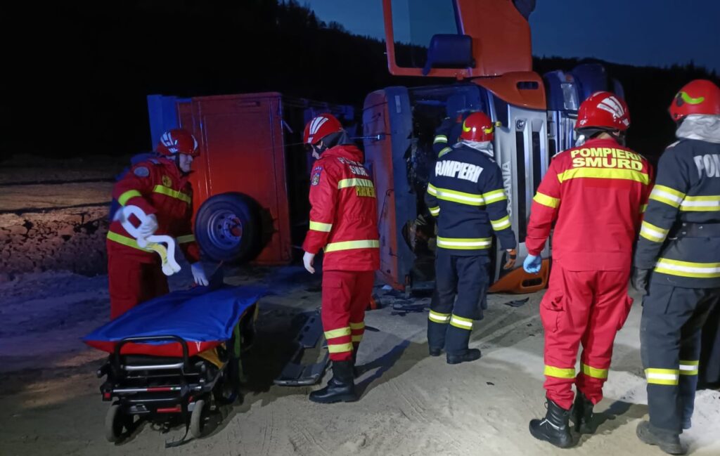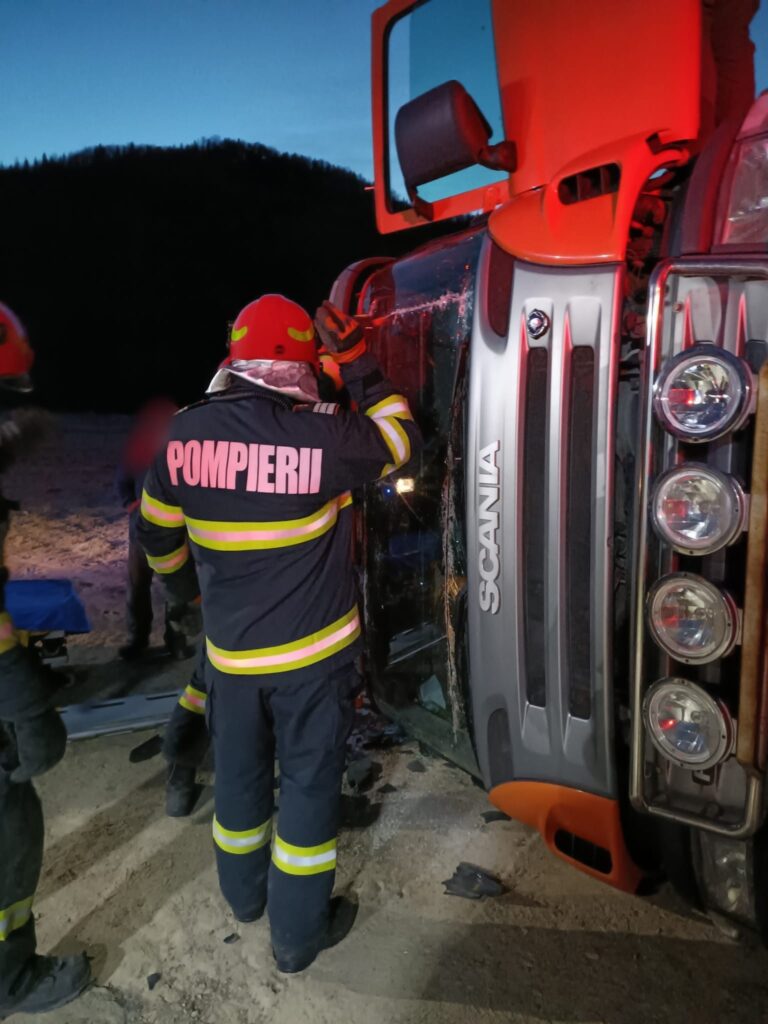 În urma evenimentului, conducătorul basculantei (bărbat, 54 de ani), conștient și cooperant, a rămas blocat în interiorul autovehiculului, fiind necesară folosirea accesoriilor specifice pentru extragerea acestuia.