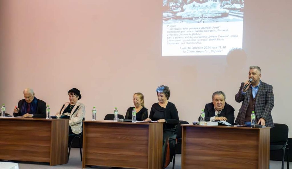 Cei prezenți în primitoarea sală a Cinema Capitol l-au aplaudat pe prof. univ. dr. Nicolae Georgescu, din București, care a vorbit auditoriului despre Eminescu și ediția princeps a volumului «Poesii”», după care elevi și profesori de la Colegiul Național „Dimitrie Cantemir” au susținut un recital de poezie, iar la final a avut loc un miniconcert al Grupului vocal „Izvorașul” de la Asociația Nevăzătorilor din România (ANR) – Filiala Județeană Bacău, coordonat de prof. Dumitru Chiuc.