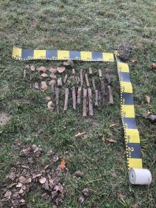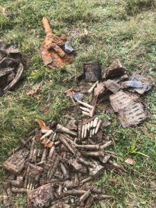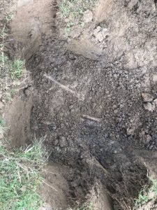 După ce am extras a doua cazma de pământ, am observat o porțiune neagră-maronie, care s-a dovedit mai târziu a fi o bucată dintr-o cartușiera din piele. Iar pe marginea gropii, ceva ce părea a fi un os. Atunci l-am chemat pe Florin, care era cu Mihaela la distanță de aprox. 50 de metri în spatele meu.