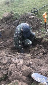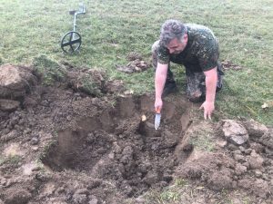 Într-unul din adăposturi am avut un semnal de adâncime care mi-a atras atenția în mod deosebit, fiind pe o suprafață relativ mare, așa că m-am decis să excavez. Am introdus cazmaua la distanță mai mare de centrul semnalului, pentru a nu distruge obiectul. Am reușit să decupez un „capac” cam de 30cm, după care am continuat în adâncime, verificând periodic cu pinpointerul.