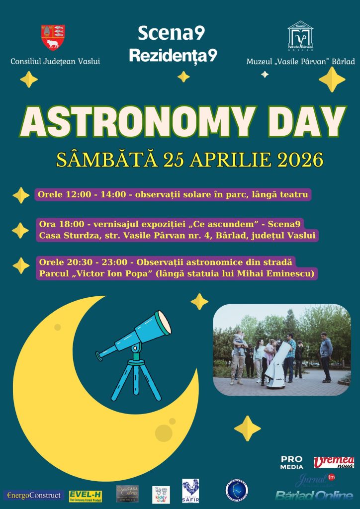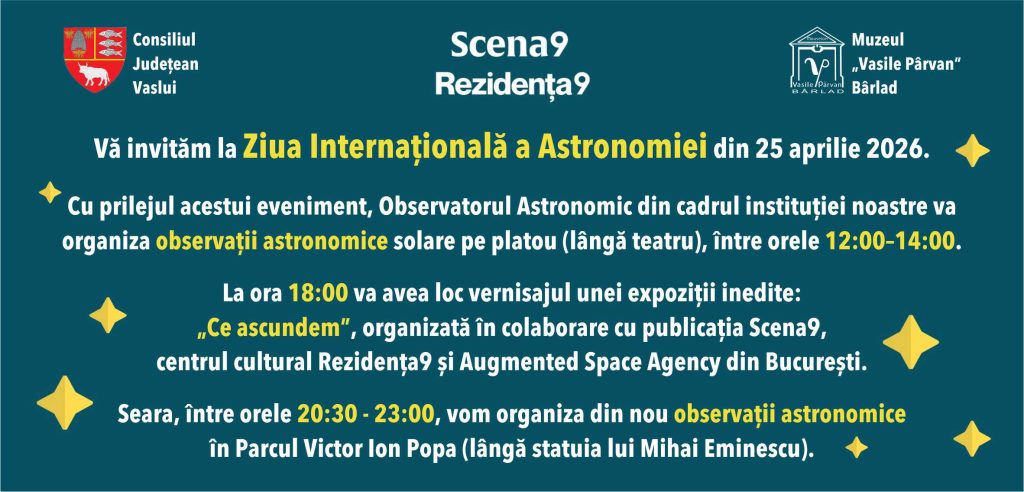 Muzeul Vasile Pârvan din Bârlad, în colaborare cu Scena9, Rezidența9 și Augmented Space Agency, organizează pe 25 aprilie 2026 vernisajul expoziției itinerante „Ce ascundem”, cu ocazia Zilei Internaționale a Astronomiei. Expoziția explorează teme precum memoria personală, traumele ascunse și spațiile invizibile ale biografiei, transformând jurnalismul și arta în experiențe interactive. Un segment special este dedicat astronomiei, prezentând descoperiri ale stelelor variabile din Bârlad și oferind vizitatorilor experiențe senzoriale prin simulatoare solare și instalații VR pentru identificarea pozițiilor stelelor. Ionuț Sociu, reporter și dramaturg al Scena9, va susține o prezentare în cadrul vernisajului. Publicul poate participa, de asemenea, la observații solare (12:00–14:00) și nocturne (20:30–23:00). Accesul este liber.