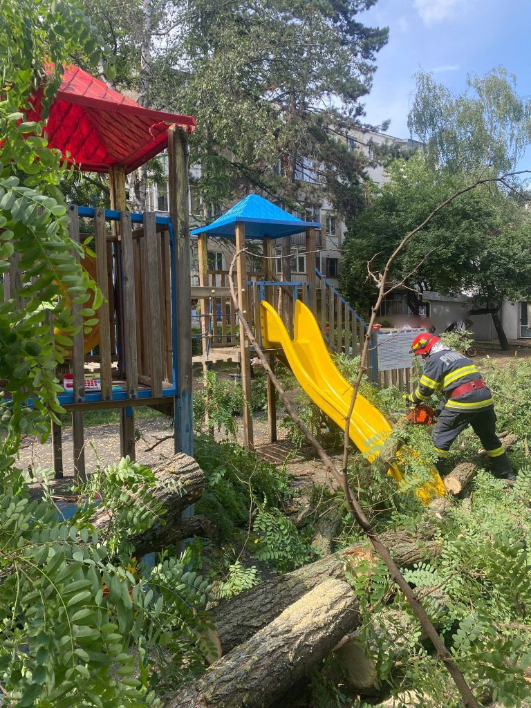Pompierii militari ai Detașamentului Suceava au intervenit pentru îndepărtarea unui arbore căzut în zona unui spațiu de joacă din municipiul Suceava (Foto-video-audio)