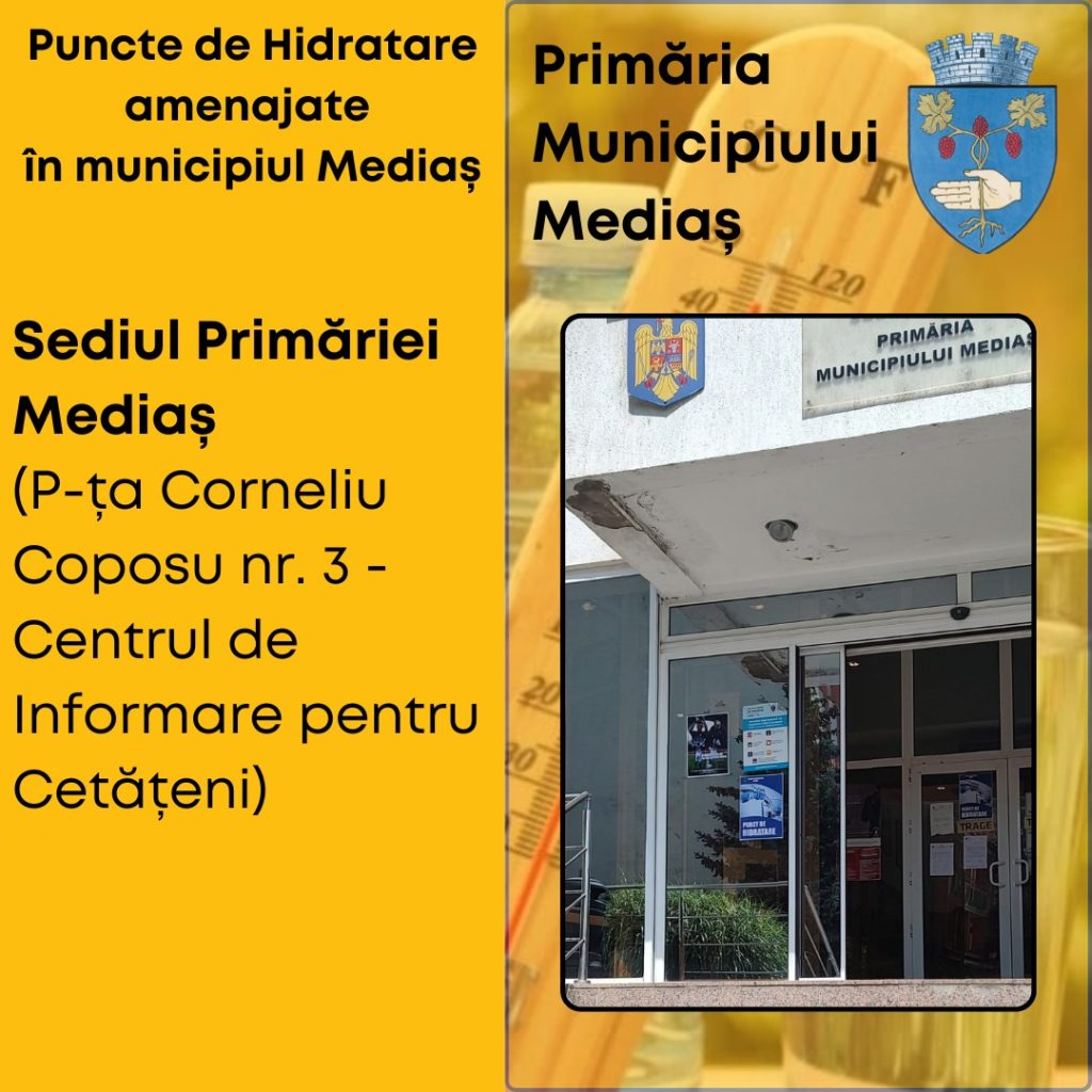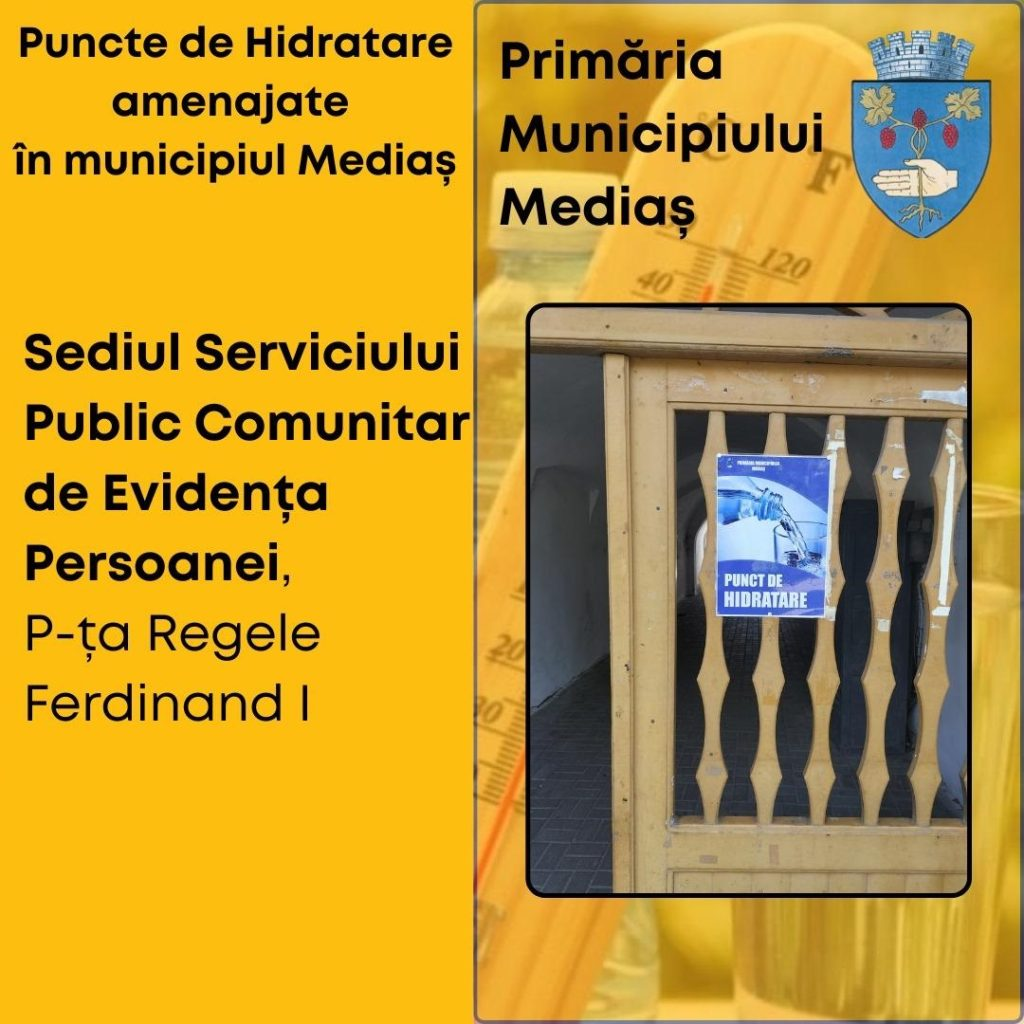 Primăria Municipiului Mediaș a amenajat trei puncte de hidratare și prim ajutor pentru a sprijini populația în perioadele caniculare. Acestea funcționează în sediul Primăriei (intrarea B), la Serviciul de Evidență a Persoanelor și în Piața Agroalimentară.