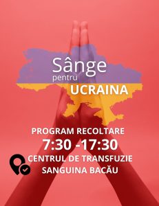 Ținând cont de faptul că, la nivelul Ministerului Sănătății, s-a luat decizia să oferim posibilitatea ca răniții din Ucraina să poată să fie tratați la spitalele din România, Centrul de Transfuzie Sanguină Bacău își extinde activitatea în următoarele două săptămâni, de luni până vineri, în intervalul orar 7:30-17:30.