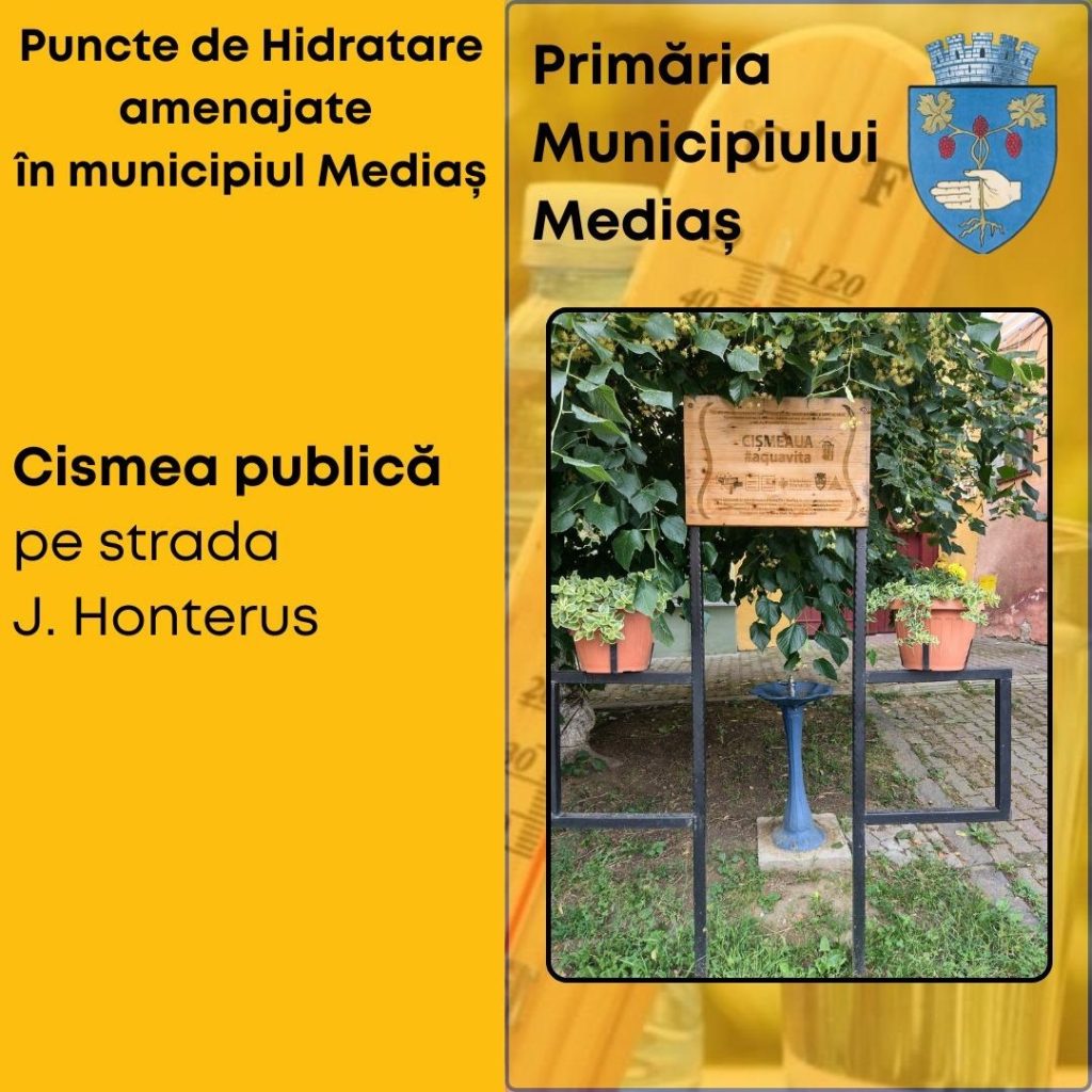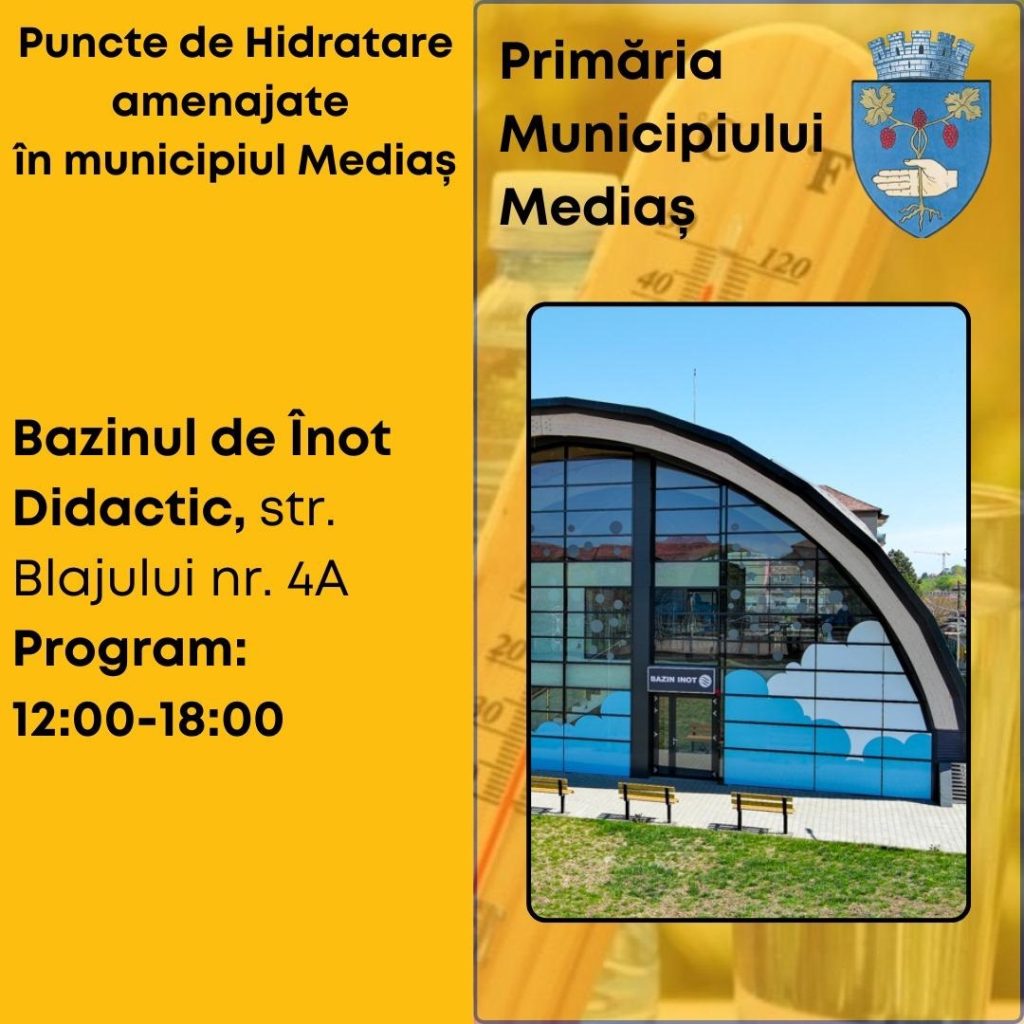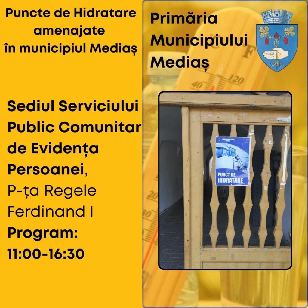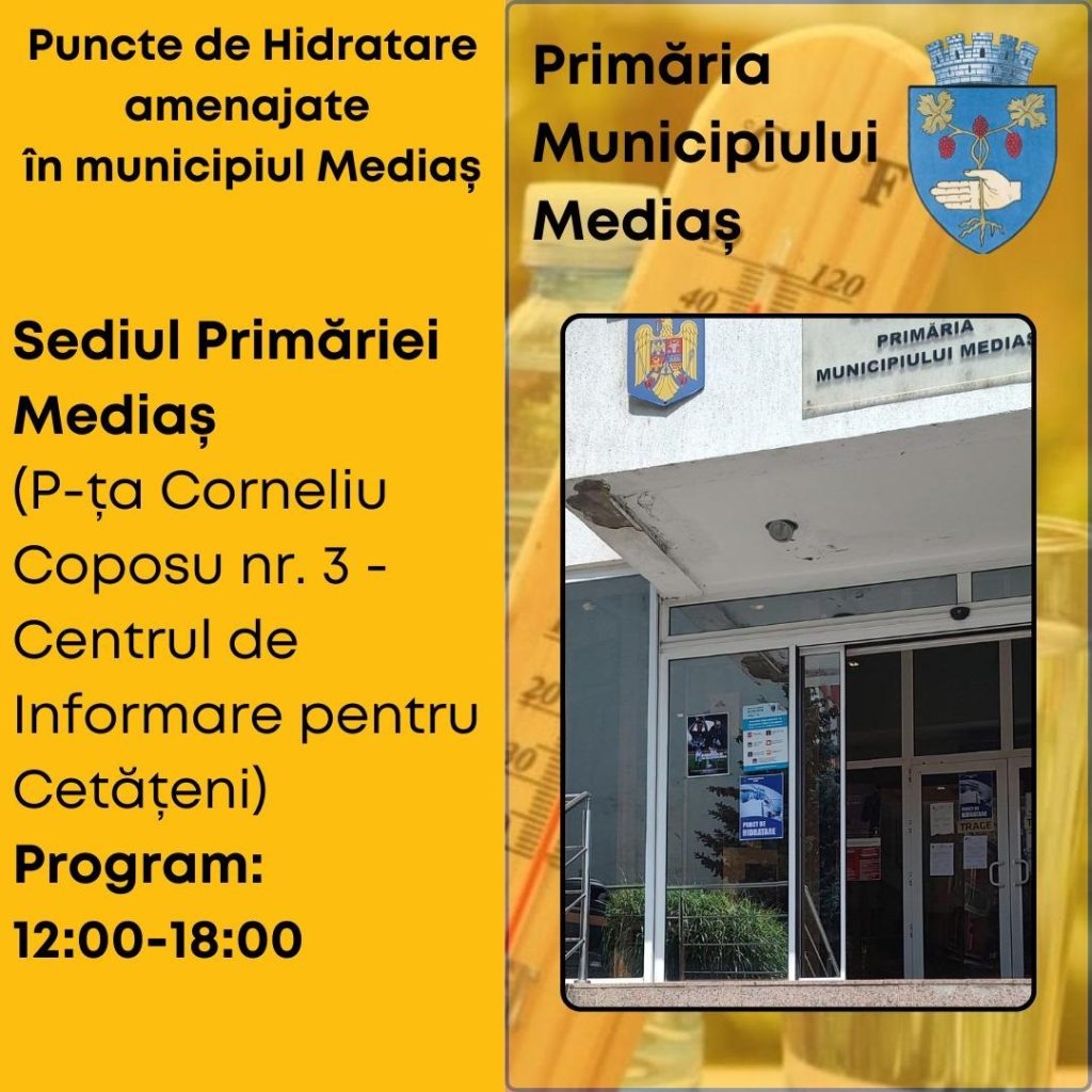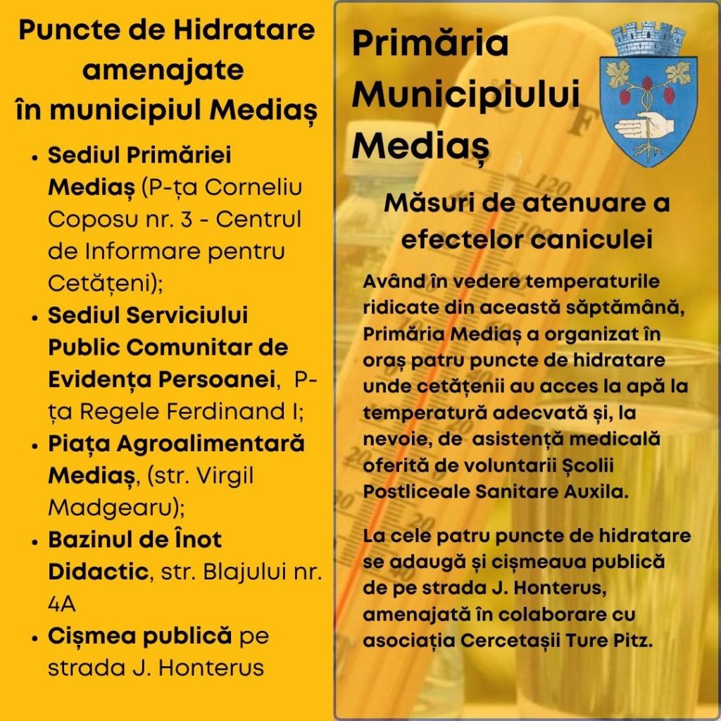 Puncte de hidratare și recomandări pentru protecția populației pe timpul caniculei la Mediaș – având în vedere temperaturile ridicate din zilele de 13 și 14 august, Primăria Municipiului Mediaș a amenajat patru puncte de hidratare în oraș, unde cetățenii pot beneficia de apă la temperatură adecvată și, dacă este necesar, de asistență medicală oferită de voluntarii Școlii Postliceale Sanitare Auxila.