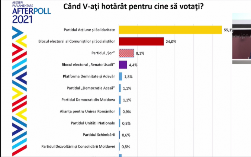 Astfel, după numărarea a peste 76% dintre voturi, PAS se situează pe primul loc, cu 46,9%. Blocul comunisto-socialist are 31,1% iar partidul Sor 6,9%. Alte partide nu mai intră în Parlament. AUR este cotat cu 0,4%.