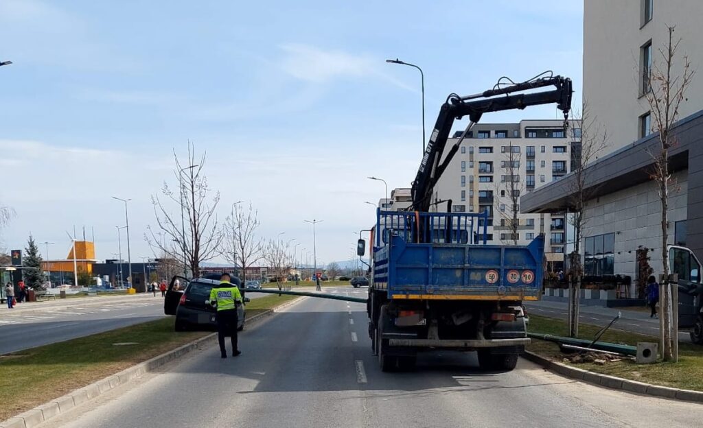 Stâlp de iluminat căzut pe un autoturism în Brașov. O persoană a fost rănită (Foto)