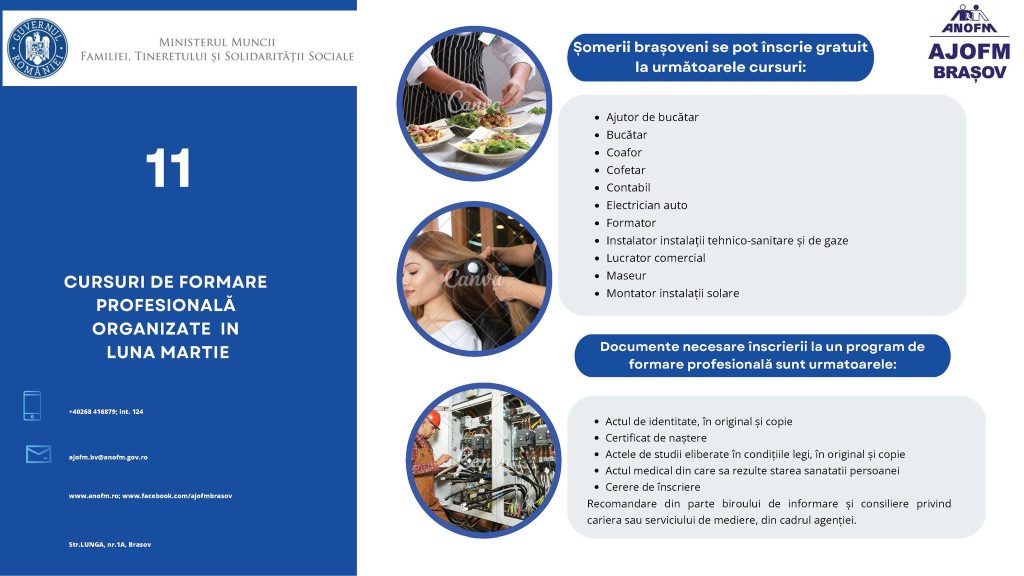 Perioada preconizată pentru începerea celor 11 cursuri de formare profesională este cuprinsă între 24 – 28 martie 2025.