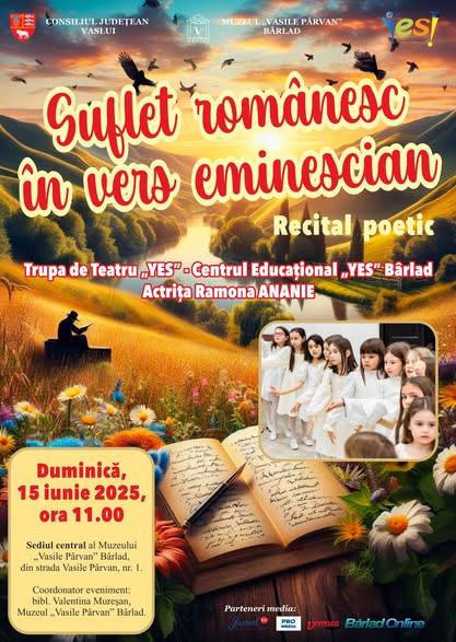 Cu ocazia împlinirii a 136 de ani de la trecerea în eternitate a poetului național Mihai Eminescu, Muzeul „Vasile Pârvan” din Bârlad, în colaborare cu Centrul Educațional „YES” Bârlad, coordonat de Anca Sandu, organizează un eveniment comemorativ duminică, 15 iunie 2025, începând cu ora 11:00.