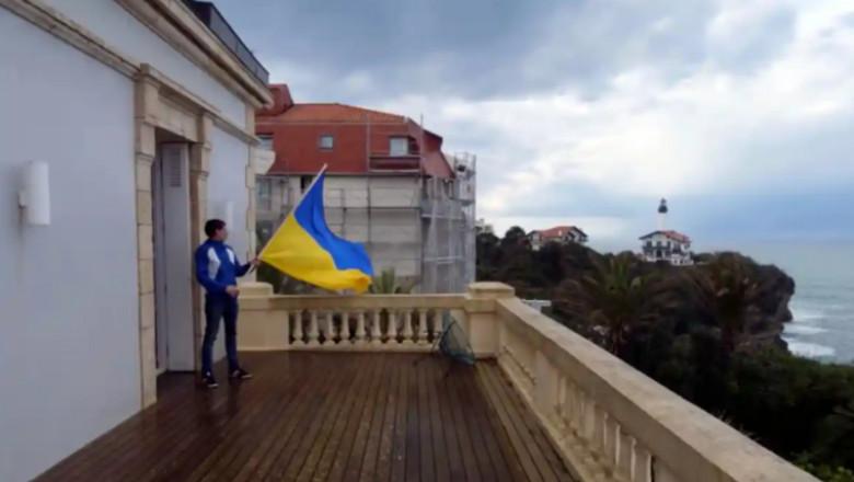 Unul din activiști flutură pe balconul vilei steagul Ucrainei FOTO: YouTube/ The GuardianDoi activiști au forțat intrarea și au ocupat o vilă de lux din Biarritz, sud-vestul Franței, deținută de fostul ginere al lui Vladimir Putin. Cei doi spun că au schimbat încuietorile și vor pune proprietatea la dispoziția refugiaților ucraineni.
