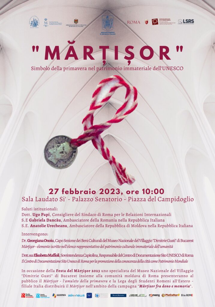 Evenimentul „MĂRŢIŞORUL. Simbolul primăverii inclus în patrimoniul imaterial al UNESCO” va avea loc pe 27 februarie, de la ora 10,00, în sala Laudato Si’ a Palatului Senatorial din Roma (Piazza del Campidoglio), informează Muzeul Naţional al Satului „Dimitrie Gusti”, într-o postare pe Facebook.