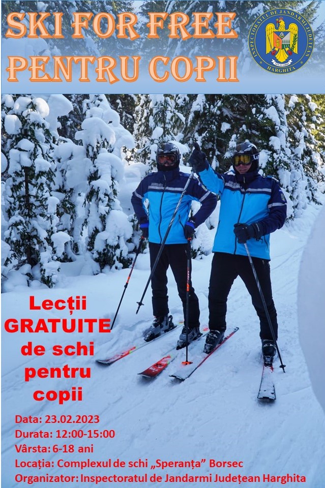 Jandarmii harghiteni se alătură campaniei naţionale „Ski for free pentru copii”, lansată de Jandarmeria Română, urmând să fie oferite lecţii gratuite de schi, pe pârtia din Borsec.