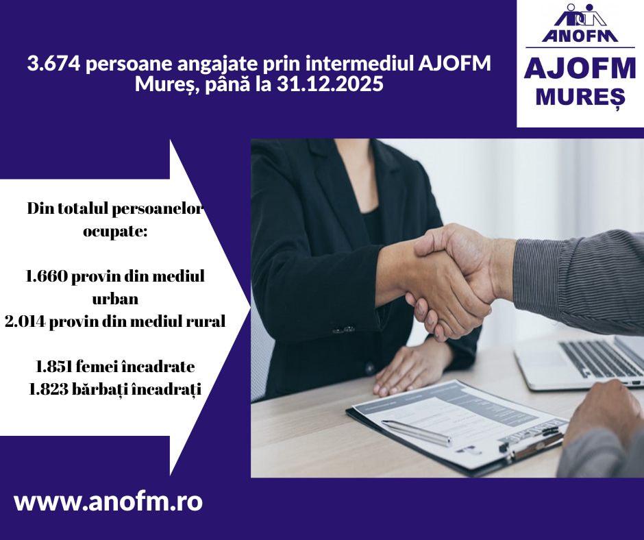 În cursul anului 2025, ca urmare a implementării Programului Naţional de Ocupare a Forţei de Muncă, prin intermediul Agenției Județene pentru Ocuparea Forței de Muncă (AJOFM) Mureș au fost încadrate în muncă 3.674 de persoane, dintre care 1.851 de femei.