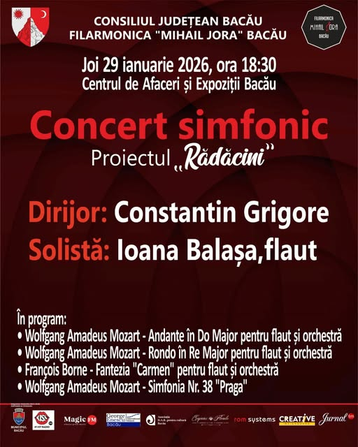 Filarmonica „Mihail Jora” Bacău invită publicul la un concert simfonic ce va avea loc joi, 29 ianuarie, de la ora 18:30, la Centrul de Afaceri și Expoziții.