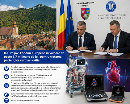 Consiliul Judeţean Braşov a accesat peste 3,7 milioane de lei din fonduri europene pentru tratarea pacienţilor cardiaci în stare critică, prin care vor fi achiziţionate un sistem ECMO veno-arterial, un ecocardiograf de înaltă performanţă şi un ecocardiograf portabil; preşedintele CJ, Adrian-Ioan Veştea, a semnat, cu Ministerul Investiţiilor şi Proiectelor Europene, contractul pentru acordarea finanţării nerambursabile în vederea implementării proiectului „Şansă pentru inimile pacienţilor cardiaci critici”; potrivit contractului, suma maximă a finanţării nerambursabile este echivalentă cu 98% din valoarea totală eligibilă aprobată, iar perioada de implementare este de 20 luni.