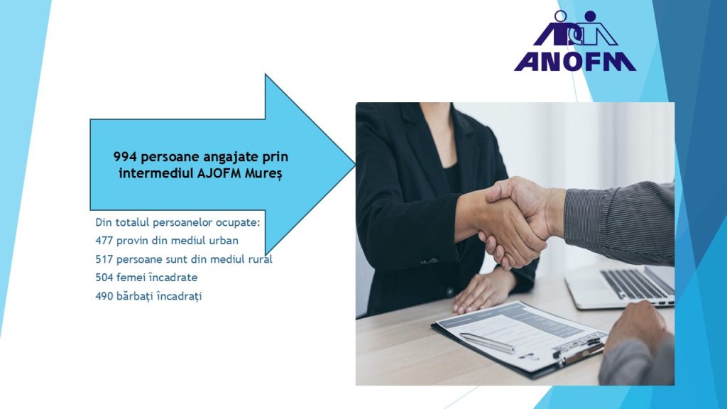 8. În perioada ianuarie–aprilie 2025, Agenția Județeană pentru Ocuparea Forței de Muncă (AJOFM) Mureș a facilitat angajarea a 994 de persoane, în cadrul Programului Național de Ocupare a Forței de Muncă