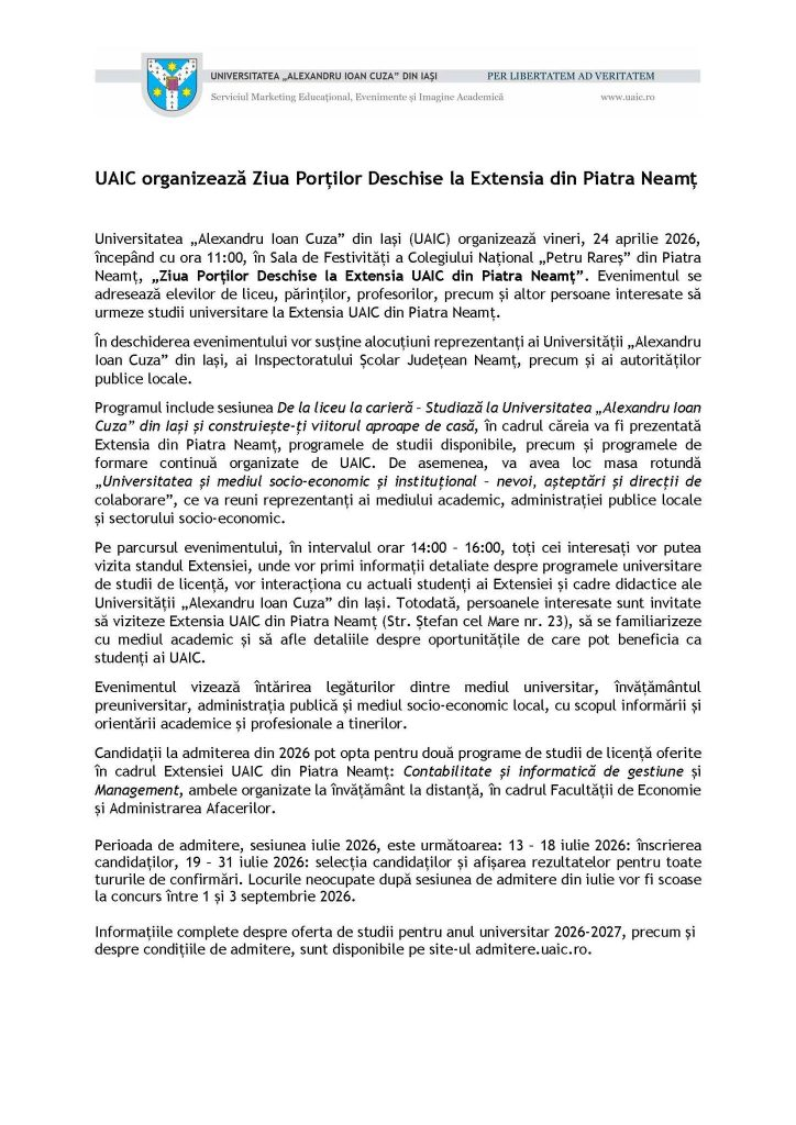 Universitatea „Alexandru Ioan Cuza” din Iași, în parteneriat cu Municipiul Piatra-Neamț, organizează pe 24 aprilie 2026, în Sala de Festivități a Colegiului Național „Petru Rareș”, Ziua Porților Deschise la Extensia UAIC din Piatra-Neamț.
